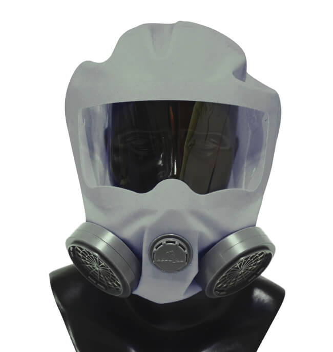 - Phần đầu của mặt nạ thường được làm bằng vật liệu chống cháy. Bên ngoài được phủ một lớp bạc nhôm để ngăn sự bức xạ nhiệt cao. Tránh gây tổn thương vùng đầu cho người đang thoát hiểm.