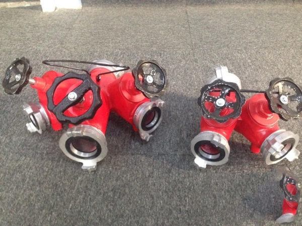 3 chạc tiếp nước chữa cháy 65-50-65-50, ngõ vào DN65, 2 ngõ ra DN50, 1 ngõ ra DN65, thân bằng gang đúc sơn đỏ, ty thép, tay vặn màu đen.